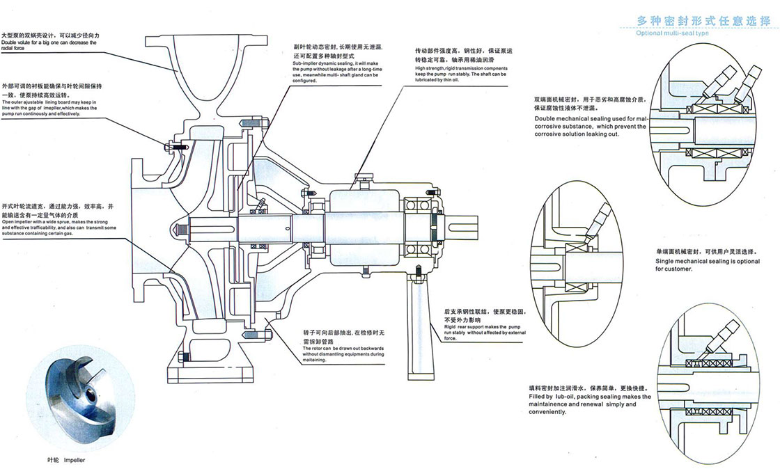 軸封型式包括:副(fù)葉輪動態(tài)密封(Y)、單(dān)端麵機械密封(S)、雙端麵機械密封(D)、填料密封(P)。